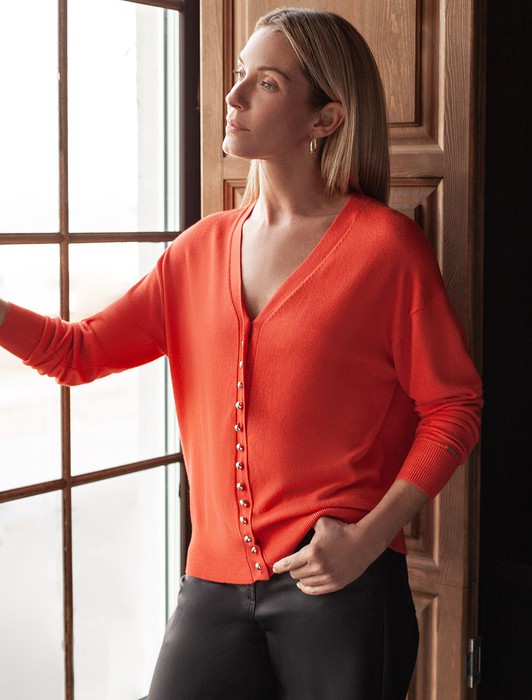 Состав: 80%Вис 20%ПА Плотность: 314 GGКардиган тонкой вязки выполнен из нежной пряжи вискозы с нейлоном. Лаконичный силуэт дополнен яркой фишкой изделия - ряд золотистых пуговиц, визуально вытягивающий силуэт. Очень приятное к телу изделие, в котором будет не жарко даже в самые теплые дни. Изделие дополнено логотипом бренда.