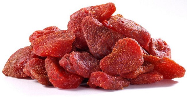 В сушёной клубнике много витаминов: РР, А, В1, В2, В3, В9, С, Н. Углеводы на 80% состоят из фруктозы, сахарозы, глюкозы. Имеется широкий спектр минералов: калий, бор, магний, марганец, йод, кальций, натрий, железо, хлор, сера. В составе есть пектины, эфирные масла, фенолокислоты, дубильные вещества, много хинной и яблочной кислоты. Наблюдается невысокий показатель жиров – 0,38 г. Наличие белков – 0,2 г, протеина – 0,6 г, клетчатки – 5,9 г. В 100 г сушёной ягоды содержится 31% дневной нормы углеводов (84,3 г).