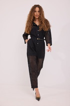 Комбинезон женский с центральной застежкой на потайную молнию и отлетной частью на запах с хлястиком и полукольцами. Задние половинки собраны на резинку в области талии. Передние воловинки с нагрудными вытачками и резинкой в области талии + шлевки. В боковых швах обработаны карманы. Ширина по талии регулирется поясом, который вставлен в правый боковой шов. В области правого кармана отделка в виде металлической подвески. По краю борта отлетной чатси отделочная строчка на 3 см.
