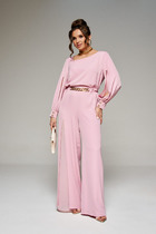 Комбинезон полуприлегающего силуэта, отрезной по линии талии. Верх комбинезона с двубортной застежкой, которая фиксируется на талии на кнопки. Линия плеча спущенная. Рукав втачной, одношёвный, заканчивающийся манжетой с застежкой на кнопки. Вырез горловины V-образный, с асимметричным воротником, пиджачного типа, по правой правой половинке. Спинка со средним швом и талиевыми вытачками. Перед со складками по талии. Нижняя часть комбинезона в виде брюк, зауженных к низу, заканчивающихся цельнокроеной манжетой, что позволяет регулировать длину. По переду карманы, складки по талии. Нижняя часть с застежкой - молнией. В комплекте бандо, из трикотажного полотна, брошь. Декоративные элементы могут отличаться от фото.