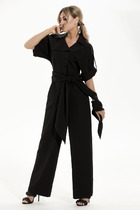 Комбинезон женский летний свободного кроя с широкими укороченными брюками. По переду изделие отрезное по линии талии. На брючинах имеются карманы( накладной с клапаном и в боковом шве). По спинке изделия расположены накладные клапаны. комбинезон без застежки. Изделие дополнены съемным поясом.
