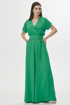 Женский летний комбинезон полуприлегающего силуэта с цельнокроенными рукавами и карманами в боковых швах, отрезной по линии талии, по спинке V-образный вырез с имитацией запаха. В комплекте съемный пояс из основной ткани.