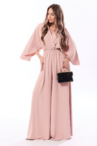 Комбинезон с центральной застежкой на потайную молнию в среднем шве спинки, без воротника, с V-образным вырезом горловины. В боковых швах расположены карманы. Комбинезон без рукавов, со спущенным плечом, разрезом по плечевому шву. Комбинезон отрезной по линии талии, шов по талии присборен на резинку. Комбинезон со съемным поясом.