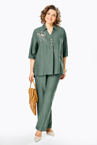 Комплект из легкой костюмной ткани.Жакет свободного силуэта с цельнокроеными рукавами, центральной застежкой на одну пуговицу и удобными функциональными карманами по переду.Воротник отложной с лацканами.Брюки свободного прямого силуэта с высокой посадкой и эластичной резиной по поясу.