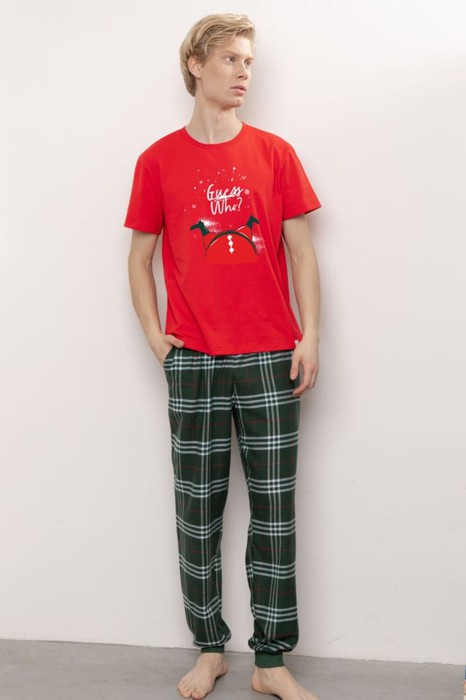 Мужской комплект состоит из фланелевых брюки и классической футболки. Брюки свободного прилегания с манжетой по