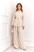 Костюм женский из кулирного полотна состоит из кофты и брюк. Кофта прямой силуэт, горловина круглая, по центру планка с застежкой на петли-пуговицы, рукав втачной 3/4, низ обработан на плоскошовной машине, на полочке принт. Брюки прямые, верх на поясе с резинкой, в боковых швах карманы, низ брюк на манжете.