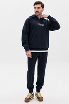 Костюм мужской футболка и брюки. Футболка прямого силуэта с коротким втачным рукавом. Горловина V-образной формы, обработана воротником стойкой. На полочке изделия принт. Декоративный элемент погоны. Низ рукава и футболки подогнут. Брюки прямого силуэта с притачным поясом. Карманы формы "хулиган". Низ изделия подогнут.