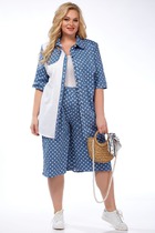 Домашний костюм состоит из туники и бриджей. Туника из кулирки, на горловине отстроченные складки с кантом, по переду принт, по боковым швам разрезы, рукав короткий. Бриджи в обтяжку из кулирки с лайкрой. По низу изделий широкая подгибка.