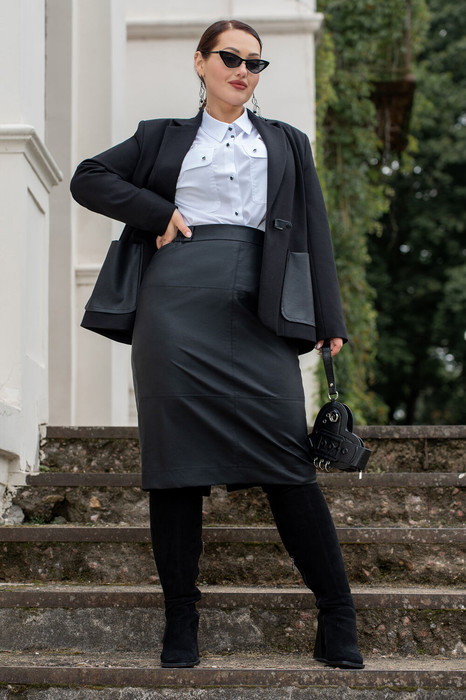 Костюм женский  жакет на подкладке  и юбка  из экокожи на подкладке.Жакет женский прямого силуэта с V- вырезом горловины, с воротником пиджачного типа, на подкладке. Полочка с накладными карманами, с центральной бортовой застёжкой на "клеванту". Спинка асиметричная с декоративным карманом "в рамку". Жакет с плечевыми накладками. Жакет с втачными двухшовными рукавами. Жакет на подкладке.   Юбка прямого силуэта, на поясе (по спике в поясе резинка) застёгивающимся на петлю и пуговицу, на подкладке. Юбка из качественной эко кожи, с горизонтальными подрезами по переду и по спинке, с отделочными строчками по подрезам, по спинке в среднем шве обработана потайная молния и по низу отлетная шлица.