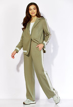 Стильный и гармоничный костюм состоит из блузки и юбки. Геометрический принт блузки притягивать к себе взгляд. Блузка прямого силуэта с нагрудными вытачками и декоративной отделкой по горловине, низу изделия и низу рукава. Рукав втачной одношовный. Спинка без особенностей. Юбка прямого силуэта со шлицей спереди по левой части. Пояс притачной с эластичной тесьмой по спинке, что обеспечивает максимально комфортную посадку на любой тип фигуры.