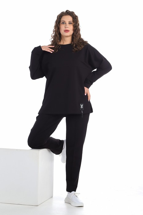 Костюм молодежный из гладкокрашеного трикотажного полотна «футер-двунитка», состоящий из джемпера и брюк. Джемпер – с втачными длинными рукавами, горловиной овальной формы, обработанной втачной планкой, разрезами в боковых швах и принтом на передней детали, выполненным в технике шелкографии. Основная деталь переда отрезная на уровне груди, рукава – с притачными манжетами, по низу полочки настрочен декоративный элемент. Брюки длинные, классического покроя, на притачном поясе с эластичной тесьмой внутри и карманами в боковых швах. Передние половины застрочены по линиям центра, на задних половинах обработаны две вытачки в области линии талии.