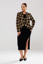 Лаконичный крой, модные цвета и идеальная посадка делают этот комплект-тройку актуальным во все времена! Жакет полуприлегающего силуэта с центральной застежкой на одну пробивную петлю и пуговицу. Перед с рельефными швами, с горизонтальными карманами с клапаном и двумя обтачками. Спинка со средним швом и рельефными швами, выходящими от линии проймы. Рукава втачные, двухшовные, низ декорирован пришивной пуговицей. Воротник – втачная стойка. Жакет на подкладке и с плечевыми накладками. Блуза полуприлегающего силуэта с фигурной линией низа. Перед с нагрудными вытачками. Застежка по центру горловины спинки на навесную петлю и пуговицу. Рукава – крылышко со сборкой по окату. Юбка зауженная к низу, на притачном поясе, застегивающемся на одну петлю и пуговицу. Застежка в среднем шве заднего полотнища на потайную тесьму-молнию. Переднее полотнище с талиевыми вытачками. Заднее полотнище с талиевыми вытачками и средним швом, заканчивающимся шлицей. Юбка на подкладке.