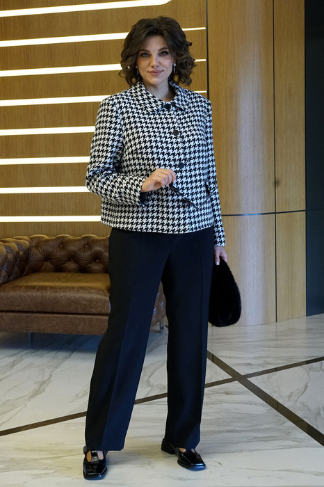 Комплект состоит из жакета и брюк. Жакет прямого силуэта, на подкладке, с застёжкой на петли, пуговицы. Перед с нагрудными выточками, прорезными карманами. Рукава втачные, двухновные. Воротник отложной