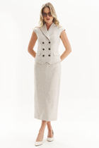 Костюм двухпредметный, состоящий из элегантного женского жилета, полуприлегающего силуэта с застежкой на декоративную тесьму, полукольцо и потайную пуговицу. Жилет на подкладке.