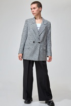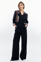 Жакет свободного силуэта, двухбортный со спущенным плечом. Перед и спинка на кокетках. По переду в кокетках декоративные клапаны. Рукав длинный на притачной манжете.