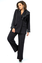 Жакет на запах приталенного силуэта с V- образным вырезом. По переду заложены складки.Застежка в виде пояса. Полочки ассиметричные по низу с заостренными углами. Перед жакета на подкладке.