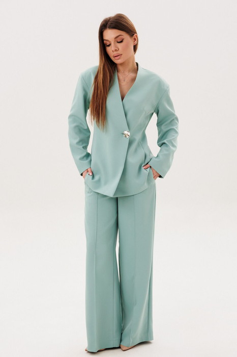 Жакет полуприлегающего силуэта обладает спущенными плечами и V-образным вырезом, что добавляет образу изысканности. Функциональные детали включают подкладку, втачные длинные рукава и действующие карманы в рельефах по переду. Застежка на петлю-пуговицу. Спинка жакета оформлена средним швом и рельефами для идеальной посадки.