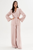 Костюм женский с брюками выполнен из двух видов ткани из мягкого и приятного в носке замша и практичной в носке костюмной ткани. Жакет женский полуприлегающего силуэта, по полочке обработаны рельефные швы. Центральная часть полочки, воротник и подборт выполнены из замша, спинка, рукав и боковая часть полочки из костюмной ткани. Воротник пиджачного типа, застежка центральная на петли и пуговицы. Спинка со средним швом и рельефами. Рукав втачной двухшовный в локтевом шве рукава обработана по низу шлица не функциональная с петлями и пуговицами.