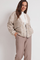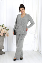 Костюм женский 2-х предметный: жакет и брюки. Жакет полуприлегающего силуэта: бочок с выточкой по полочке, по спинке средний шов. Застежка двубортная, карман клапан "обманка". Рукав двухшовный. Брюки прямые. По полочке карман и складки. Пояс на резинке. Длина жакета: 73 см. Длина рукава: 62 см. Длина брюк: 100 см