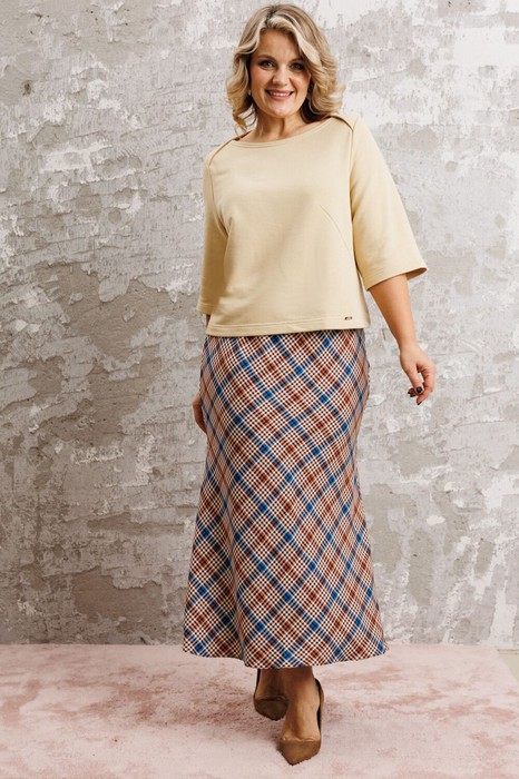 Комплект женский 2-х предметный (блузка, юбка). Отлично подойдет на любой тип фигуры, подчеркнет вашу женственность. Блузка из трикотажного полотна футер прямого силуэта. По переду нагрудные вытачки с бокового шва. Горловина в форме "лодочки". Рукав одношовный, втачной, 3/4 длины. В качестве декора- металическая нашивка с логотипом фирмы по низу блузки. Юбка по косой. Пояс на резинке. Длина блузы-55 см . Длина рукава -41см. Длина юбки - 92см.