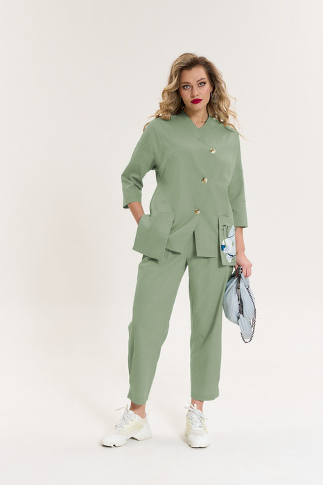 Женский брючный костюм — это идеальное сочетание стиля, комфорта и универсальности, которое станет вашим верным спутником как на деловых встречах, так и при повседневной носке. Изготовленный из высококачественной ткани, этот костюм обеспечивает легкость и приятные ощущения при носке. Костюм женский 2-хпредметный (жакет и брюки).  Жакет из текстильной ткани прямого силуэта со спущенным плечом. По полочке идут грудовые выточки из бокового шва. Застежка ассиметричная. Воротник стойка. По спинке встречная складка. Рукав 3/4. По полочке идут отлетные накладные карманы с декором (термонаклейка). Брюки прямые, зауженные к низу за счет защипов. Пояс на резинке, по бокам карманы. Длина спинке:(48-52)-70см, (54-58)- 73см. Длина рукава:(48-58)-33см.  Длина брюк (48-50) -93см, (52-58)-95см