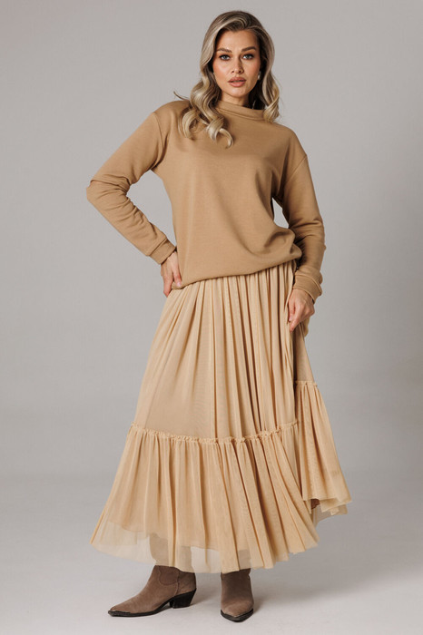 Оригинальный  женский комплект от бренда Anastasia, идеальный для любого случая. Этот костюм сочетает в себе элегантность и комфорт, что делает его подходящим как для повседневной носки, так и для праздничных мероприятий. Джемпер  оверсайз из трикотажного полотна. Прямого силуэта со спущенным плечом.  Воротник-стойка. По рукаву идет подрез с разрезом. Низ рукава и низ джемпера - на манжете. Джемпер лекго сочетается с любыми низами: брюки, джинсы, юбка.  Юбка макси из 2-х видов ткани: верх с отрезным валаном из стрейчевой сетки, подкладка юбка солце из шифона.  Пояс на декоративной резинке. Фасон универсален, а использование резинки на поясе повышает комфортность носки, позволяя юбке адаптироваться под индивидуальные особенности фигуры. Юбку легко сочетать с различными верхами: топ, блузка, футболка, кружевной жакет, свитер или жакет из тексиля - все это позволит создавать различные образы на разные случаи. Длина по спинке  68см. Длина рукава (с манжетой): 60см. Длина юбки:  90 см