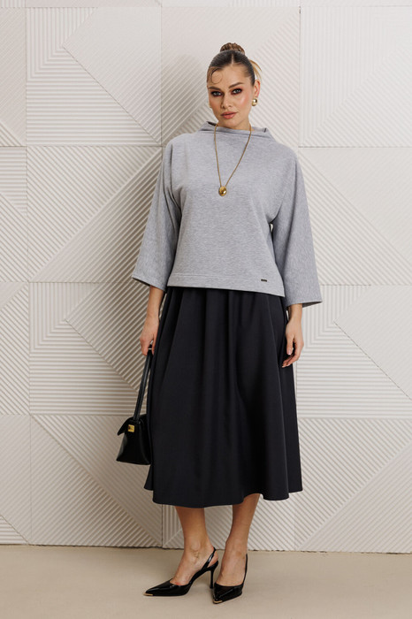 Представляем вашему вниманию стильный  комплект, который станет настоящим маст-хэвом в вашем гардеробе. Этот комплект станет вашим верным спутником в любой ситуации, добавляя нотки элегантности и шарма в вашу повседневную жизнь. Комплект женский 2-х предметный (блузка, юбка). Блузка прямого силуэта,  из трикотажного полотна двухнитка, со спущенным плечом станет незаменимой вещью в вашем гардеробе. Рукав "летучая мышь", 3/4 длины. Горловина цельнокроенная в виде стойки. В качестве декора -брендированная металлическая нашивка по низу блузки.  Юбка расширенная к низу.  Пояс на резинке. Для повседневного ношения отлично подойдёт будущим мамам и беременным.  Мягкая резинка в поясе не давит и идеально держится на любой талии.    Отдельные части крмлекта будут легко сочитаться с вещеми из вашего гардероба. ВНИМАНИЕ! Колье не входит в комплект.  Длина блузки(по спинке): (50-60)-60 см. Длина рукава от головины: (50-60) -56см. Длина юбки - 85см.
