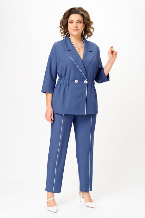 Стильный  женский костюм  от бренда Anastasia, идеальный для любого случая. Этот костюм сочетает в себе элегантность и комфорт, что делает его подходящим как для деловых встреч или прогулок. Комплект состоит из жакета и брюк. Костюм женский 2-хпредметный (жакет и брюки). Жакет на подкладке из текстильной ткани полуприлегающего силуэта со спущенным плечом. Приталивание по талии создается за счет кулиски с резинкой. По полочке идут грудовые выточки из бокового шва. Застежка двубортная. Воротник английского типа. По правому борту идет отделка- кант. По бокам карманы. По спинке средний шов. Рукав 3/4. Брюки, зауженные к низу. Пояс на резинке. По передней части – вставка кант. Стильный костюм отлично подойдет для долгих прогулок или для работы, для офиса. Брюки -клеш, пояс на резинке. По внутреннему срезу по низу идут разрезы.  Отдельный части костюма легко будут сочетаться с вещами из Вашего гардероба. Модель можно отнести к стилю кэжуал. Костюм можно носить с туфлями, кроссовками или ботинками. Обязательно добавьте наш бренд в избранное и следите за новинками, распродажами, скидками и акциями! Хороших покупок от «Анастасия». Длина  (по спинке):(50-52)- 69см, (54-58)-70 см, (60-64)-71см.  Длина рукава: (50-64)- 32см. Длина брюк: (50-54):- 91см, (56-60)- 64см, (62-64)-96см