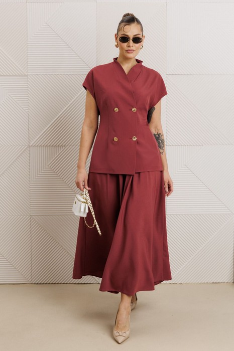 Бренд белорусской женской Anastasia представляет костюм двойку. Костюм женский 2-х предметный (жилет, юбка) из костюмной ткани станет отличным дополнением к Вашему гардеробу. Подойдет для повседневной носки (работа, офис, прогулки). Достаточно дополнить его соответствующими предметами из вашего гардероба: блузка, майка, водолазка, гольф, свитер, лонгслив, свитшот. Или акссесуарами: ремешок или пояс. Жилет полуприлегающего силуэта, со спущенным плечом. Может быть самостоятельным элементом гордерба. Застежка двухбортная. Воротник цельнокроеная стойка. По полочке идет грудовая выточка из бокового шва, по спинке средний шов. Юбка-макси, полусолнце. Пояс отрезной на резинке. По бокам - карманы. Акцентный элемент- золотые пуговицы. Благодаря своему крою и фасону костюм подчеркивает женственные формы и скрывает то, что должно быть незаметным. Это повседневный вариант на каждый день для занятий в школе или для офиса, на работу или на прогулку. Наденьте его на деловую встречу, официальное мероприятие, школьное торжество. Модель подойдёт для образа в университет или колледж. Одежда для женщин по отличным ценам и высокого качества - это Anastasia! Добавляете нас в любимые бренды и вы всегда будете в курсе всех акций и новинок! Хороших покупок от «Анастасия». Длина по спинке (48-52)-72см, (54-58)-74 см. Длина юбки (48-58) - 94см.