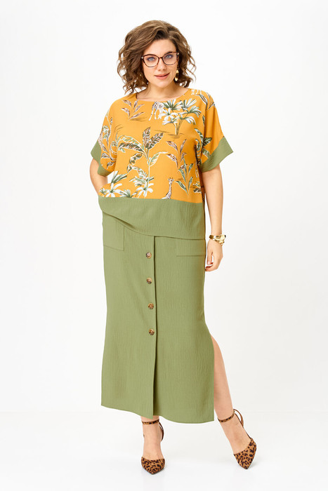 Летний  костюм от Anastasia, подходящий для нарядной и повседневной носки. Костюм женский 2-х  (блузка, юбка).  Блузка  прямого  силуэта со спущенным плечом. Отделка из однототна по низу и манжет.    Юбка прямая, по бокам разрезы. По передней части идут накладные карманы, по центру скаладка, имитирующая застежку с  пуговицами. Пояс на резинке.    Длина блузки (50-54)- 58см, (56-60)- 60см . Длина рукава от горловиный (50-54)- 35см, (56-60)-37см. Длина юбки  (50-60)- 90 см.