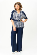Брюки формы “палаццо”. По передней половинке выполнены наклонные карманы и по линии талии встречные складки. В среднем шве обработана застежка на молнию. По задним половинкам обработаны талиевые вытачки. Брюки на притачном поясе с эластичной тесьмой и застежкой на петлю и пуговицу.