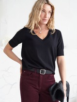 Топ полуприлегающего силуэта. Полочка топа с вертикальными рельефами, в нижней части которых обработаны разрезы. Горловина формы “каре”. Спинка топа со средним швом и вертикальными рельефами. В левом боковом шве обработана потайная молния.