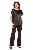 Костюм состоит из жакета и брюк. Костюм выполнен из однотонной ткани. Жакет прямого силуэта, НА ПОДКЛАДКЕ. Полочка жакета с вертикальными рельефами и двубортной застежкой на две пуговицы. Горловина V-образной формы. На нижней части полочки выполнены накладные карманы. Спинка со средним швом и отрезными бочками. Рукав длинный, втачной, двухшовный. Брюки со стрелками, зауженные к низу. По передним половинкам выполнены наклонные карманы и складки по талии. По задним половинкам обработаны талиевые вытачки. В среднем шве передней половинки брюк обработана застежка на молнию. Брюки на притачном поясе с эластичной тесьмой и застежкой на петлю и пуговицу.