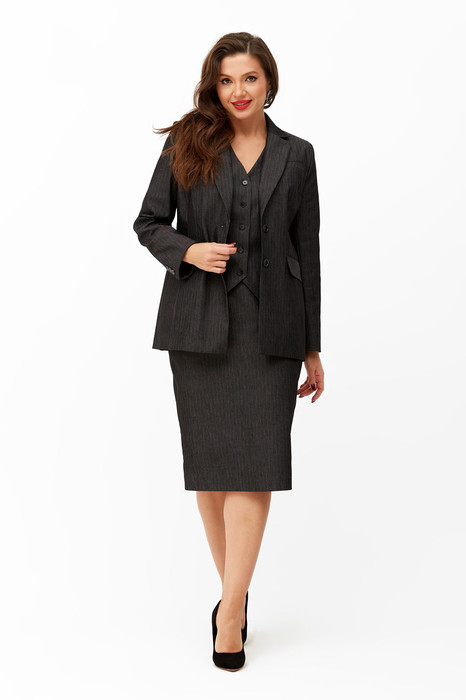 Костюм женский трех предметный, состоящий из жакета, жилета и юбки. Жакет полуприлегающего силуэта с центральной застежкой на петли и пуговицы, с пиджачным воротником, с втачными рукавами. Перед с нагрудными вытачками, отрезными бочками, прорезными карманами «в рамку» с клапаном и прорезным с листочкой. Спинка с отрезными бочками и средним швом. Рукава двухшовные со шлицей.