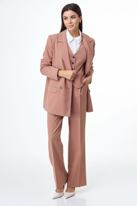 В комплект входят брюки, жакет и жилет. Сегодня сложно представить гардероб современной женщины без брючного костюма. Он актуален на всех мероприятиях, является базой офисной одежды и городской моды. Жакет двубортный, прямого свободного силуэта с втачными рукавами, отложным воротником и лацканами, функциональными прорезными карманами с клапаном. Спинка со средним швом. Жакет и жилет выполнены на подкладке. Жилет полуприлегающего силуэта, с рельефами по переду и спинке, v-образным вырезом горловины, застежкой на пуговицы, нерабочими карманами в рамку, по спинке регулируемый хлястик в области талии. Брюки классического покроя с завышенной линией талии, с боковыми функциональными карманами по переду, с притачным поясом. Комплект выполнен из однотонной ткани. Не упустите возможность приобрести комплект – он будет радовать вас не один сезон! Вся необходимая информация о производителе указана на этикетке. При съемке в образе использованы так-же швейные изделия бренда ANELLIstyle