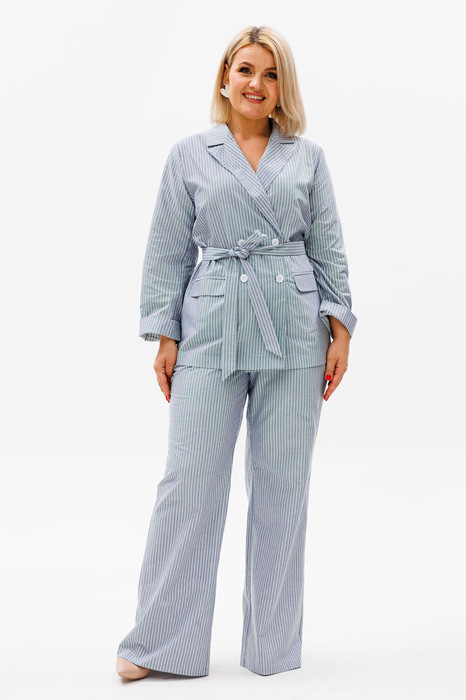 Съемный пояс дополнительно подчеркивает талию и может использоваться как в брюках, так и в жакете, позволяя создавать различные варианты стиля.