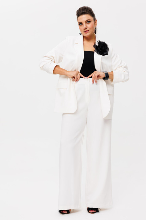 Брюки палаццо на резинке с карманами создают эффектный силуэт и придают образу легкость и грацию. Однобортный оверсайз жакет добавляет современную нотку и непринужденность, делая костюм идеальным выбором для любых случаев — от деловых встреч до вечерних прогулок.