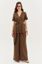 Брюки палаццо на резинке с карманами создают эффектный силуэт и придают образу легкость и грацию. Однобортный оверсайз жакет добавляет современную нотку и непринужденность, делая костюм идеальным выбором для любых случаев — от деловых встреч до вечерних прогулок.