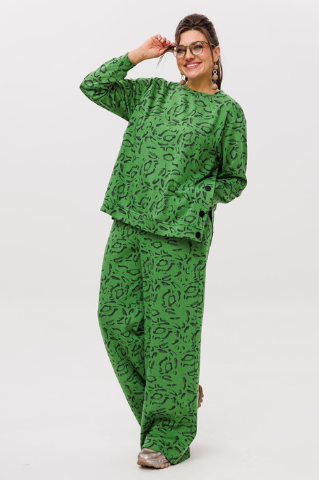 Трикотажный костюм от Анелли  с анималистичным, ярким принтом – это идеальное сочетание стиля и комфорта для повседневного гардероба. Он включает в себя просторные брюки палаццо на круговой резинке, что обеспечивает удобную посадку и легкость в движении. Благодаря свободному крою и функциональным карманам, брюки смотрятся элегантно и практичны в носке.
