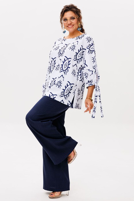 Белая блуза с таинственным принтом «Очи» будто создана для тех, кто ценит не только стиль, но и глубину образа. Свободный крой обволакивает фигуру, подчёркивая её естественную грацию, а изящный вырез «лодочка» добавляет ноту женственности. Рукав, мягко ниспадающий до манжета с деликатными завязками, играет с силуэтом, а боковые разрезы дарят лёгкость каждому движению.