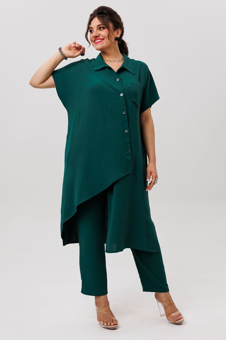 Асимметрия линий и продуманная свобода кроя создают образ, в котором гармонично сочетаются динамика и утонченность. Туника мягко струится по фигуре, ее миди-длина подчеркивает элегантность, а асимметричная застежка с петлями и пуговицами добавляет нотку неожиданности. Цельнокроеный короткий рукав сохраняет лаконичность, а воротник обрамляет горловину, придавая законченность силуэту. Разрезы по боковым швам дарят легкость движения, играя с воздушностью ткани.