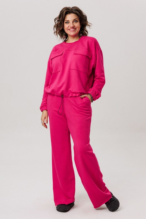 Верхняя часть костюма, выполненная в виде объемного свитшота, представляет собой мастерское сочетание расслабленных линий и продуманных деталей. Удлиненная линия плеча и длинные рукава струятся мягкими складками, завершаясь аккуратной манжетой. Фронтальная часть оформлена изящной отрезной кокеткой, а накладные карманы с клапанами, добавляют образу тактильной выразительности. Низ свитшота, оформленный на кулиске, позволяет вам самостоятельно регулировать степень свободы и объем, делая силуэт именно таким, как вам хочется сегодня.