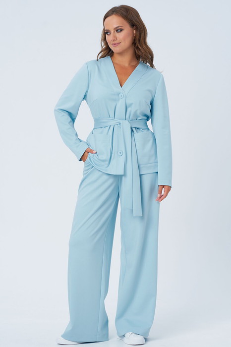 Эффектный брючный комплект из трикотажного полотна состоит из прямого жакета и широких брюк. Этот стильный комплект станет идеальным выбором для различных мероприятий и праздничных торжества, а также для работы и повседневной жизни.