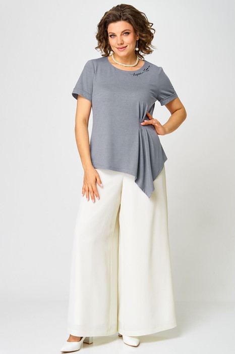 Базовый брючный комплект состоит из оригинальной блузки и широких брюк-палаццо. Блузка из тонкого однотонного трикотажного полотна с элегантными защипами по талии подчеркнет Вашу женственность и романтичность. Удлиненную блузку дополняют комфортные брюки свободного силуэта из струящегося шифона, которые помогут скрыть недостатки и вытянуть фигуру.