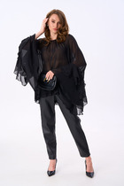 Жакет прямого силуэта, на подкладке. По переду - центральная двубортная застежка на петли и пуговицы, нагрудные вытачки и функциональные прорезные карманы с клапаном. Полочку жакета украшает съемная (на пуговицах) декоративная рюша с кружевом. Спинка со средним швом. Рукав втачной длинный двухшовный, с имитацией шлицы, декорированной пуговицами.