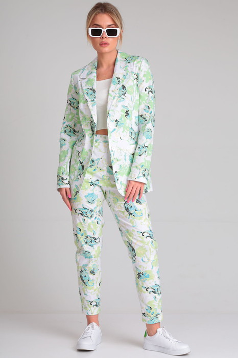 Яркий и эффектный двухпредметный женский комплект состоит из классического жакета и удобных брюк. Комплект выполнен из принтованной хлопковой ткани, которая не сковывает движения и идеальна для теплой погоды.