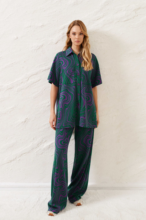 Комплект состоящий из рубашки и брюк выполнен из трикотажного полотна с абстрактным принтом - плавные линии. Характеристики: рубашка прямого свободного кроя, воротник классический - отложной, застежка центральная на петли пуговички, по переду крупные карманы, рукав втачной короткий, в боковых швах разрезы спинка цельнокроеная. Длина рубашки по спинке 75 , длина рукава 27 см. Брюки прямого свободного кроя, пояс на резинке, в боковых швах карманы. Длина брюк 117 см.