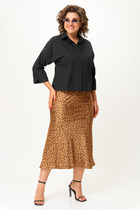 Комплект состоит из укороченной рубашки и юбки выполнен из черной ткани с цветочным принтом. Характеристики: рубашка свободного кроя, V образный вырез горловины, по низу рубашки декоративные завязки выполнены из ткани основного изделия, рукав втачной свободного кроя, по низу рукава резинка, по низу спинки резинка. Длина по спинке 37 см, длина рукава 69 см. Юбка полуприлегающего силуэта, пояс стабильный, застёжка потайная тесьма молния в среднем шве заднего полотна изделия. Длина юбки 103 см.