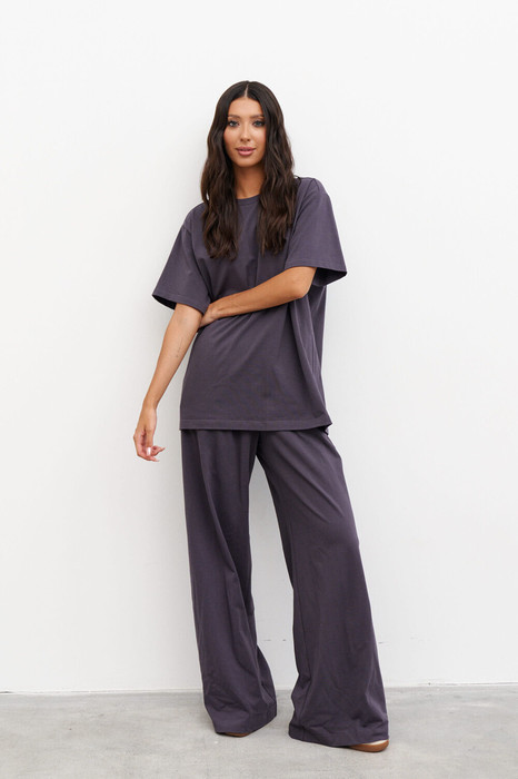 Комплект 2-х предметный, состоит из футболки и брюк выполнен из хлопкового полотна цвета графит. Характеристики: футболка прямого свободного кроя, овальный вырез горловины, рукав втачной спущенный . Длина по спинке от края горловины 70 см, длина рукава от края горловины 37 см. Брюки прямого свободного кроя, пояс на резинке, в боковых швах карманы. Длина брюк по боковому шву 112 см.