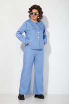 Комплект с шортами выполднен из трикотажного полотна серого цвета. Джемпер прямого широкого кроя, V-образный срез горловины, застежка центральная на петли пуговички, рукав втачной слегка спущен, по низу нашито декоративное кружево. Длина изделия по спинке 56 см, длина рукава от горловины 75 см. Шорты свободного кроя. Пояс на резинке. По передней части имитация застежки на 3 пуговицы. По низу нашито декоративное кружево. Длина 36 см.